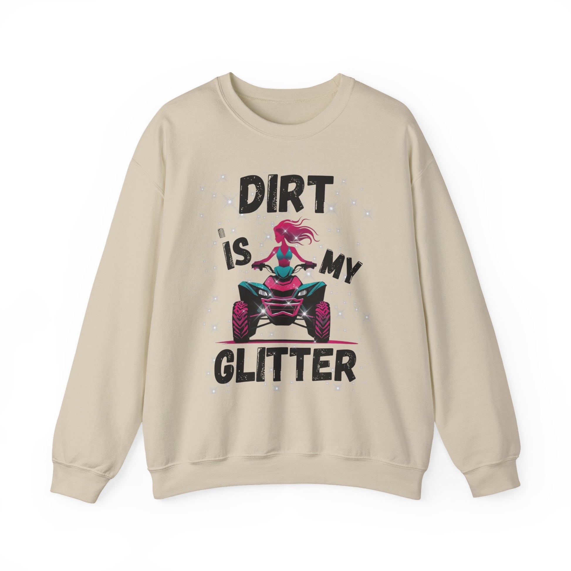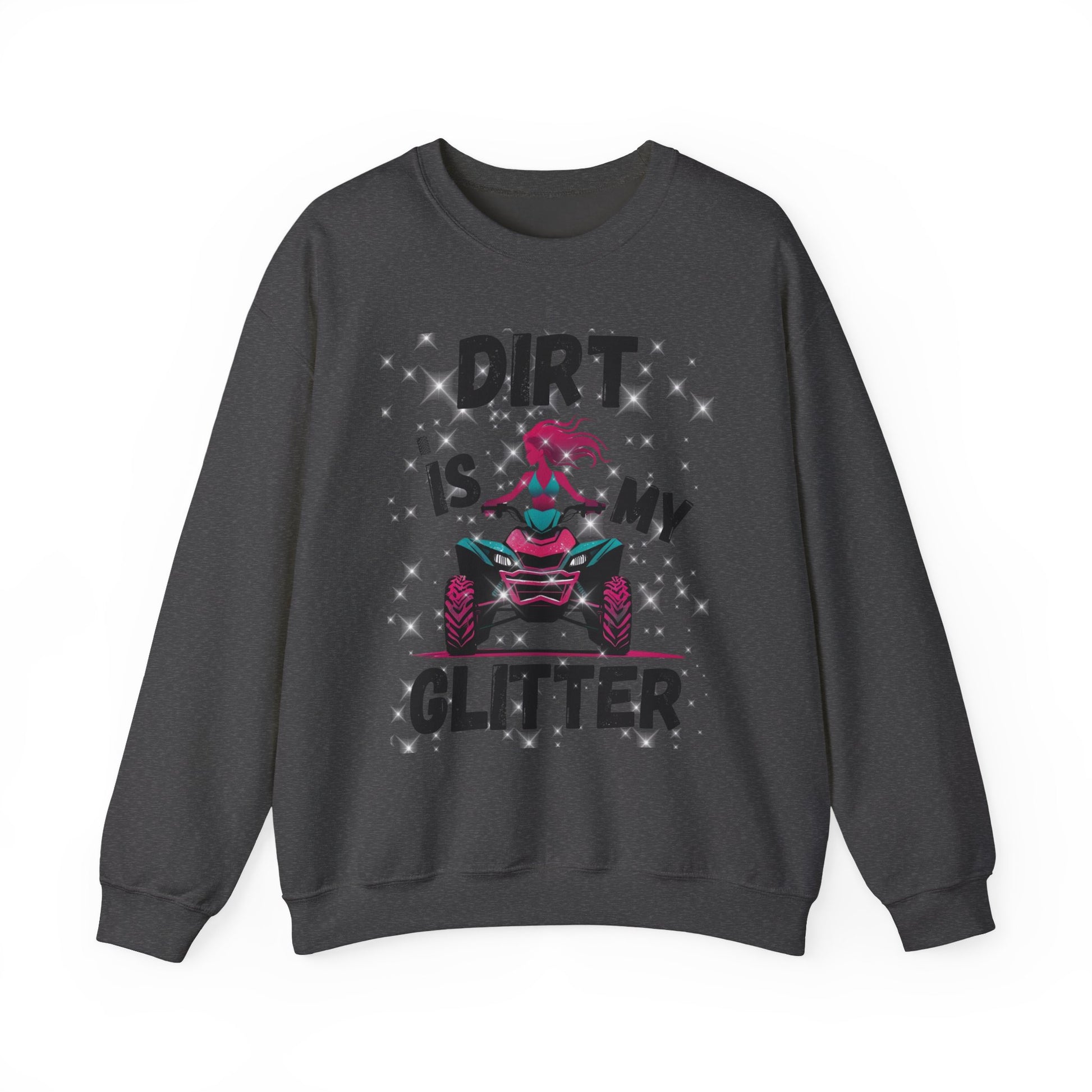 Cozy unisex sweatshirt featuring a picture of a girl on an ATV with the fun phrase 'DIRT IS MY GLITTER.' Perfect for those who love off-roading and outdoor adventures. Ideal for staying warm in colder months while making a bold statement. Great for adults who enjoy casual, comfortable clothing. Perfect for gifting on birthdays, holidays, or any occasion.
