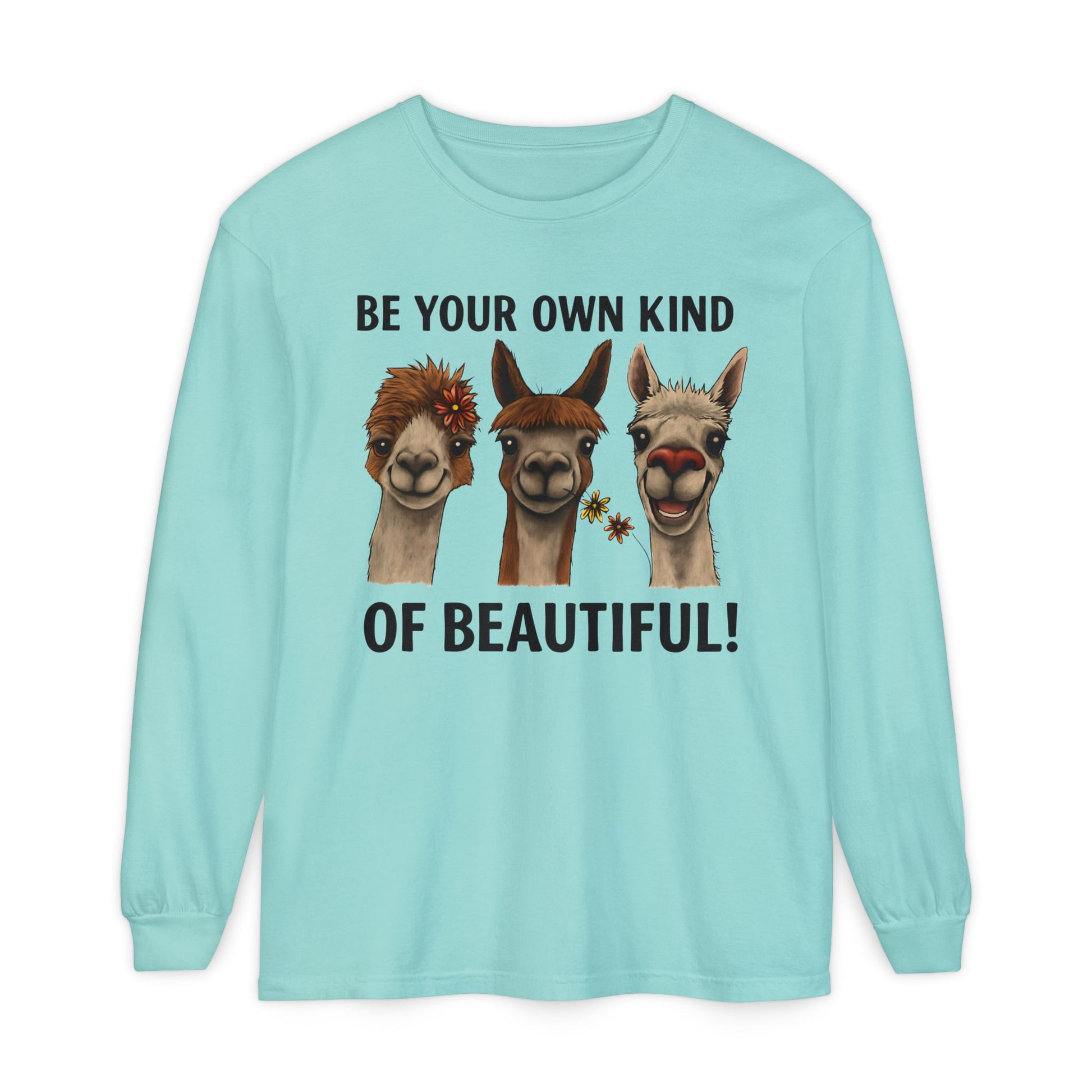 A really cute long sleeve T-shirt featuring three different-looking female llamas with a motivational message that says BE YOUR OWN KIND OF BEAUTIFUL. This shirt gives off a fun and uplifting vibe, perfect for those who love llamas and want to express their individuality. Ideal for casual wear or as a thoughtful gift for llama lovers on birthdays, holidays, or just because.