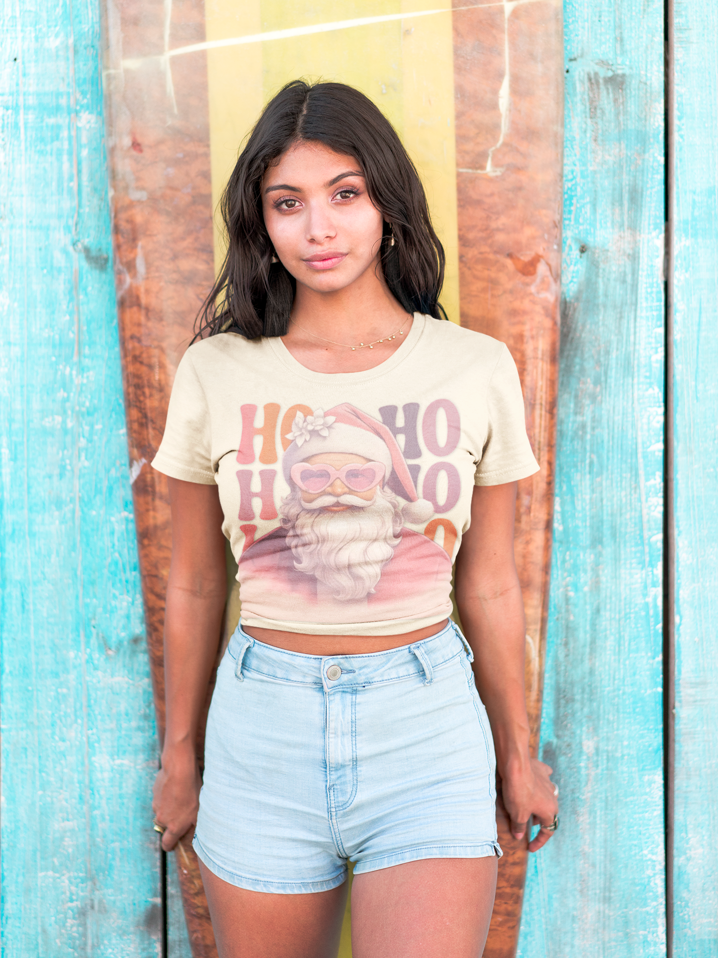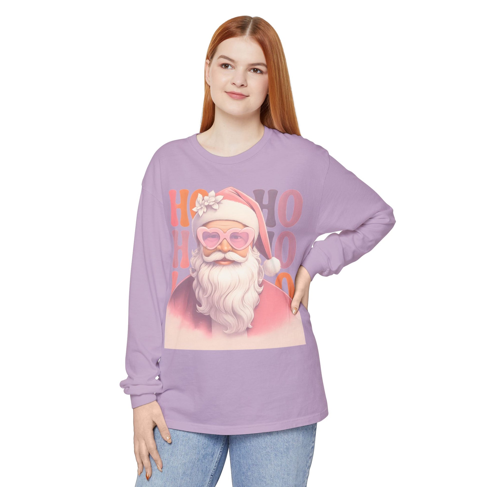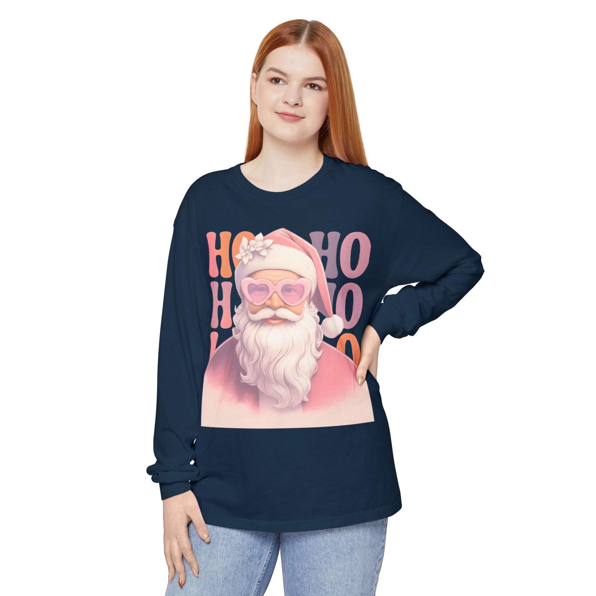 Cute Christmas theme long sleeve t-shirt featuring a picture of Santa with heart glasses and 'HO HO HO' in pastel colors. Perfect for spreading holiday cheer and adding a festive touch to your wardrobe. Ideal for adults looking for a fun and cozy holiday outfit.