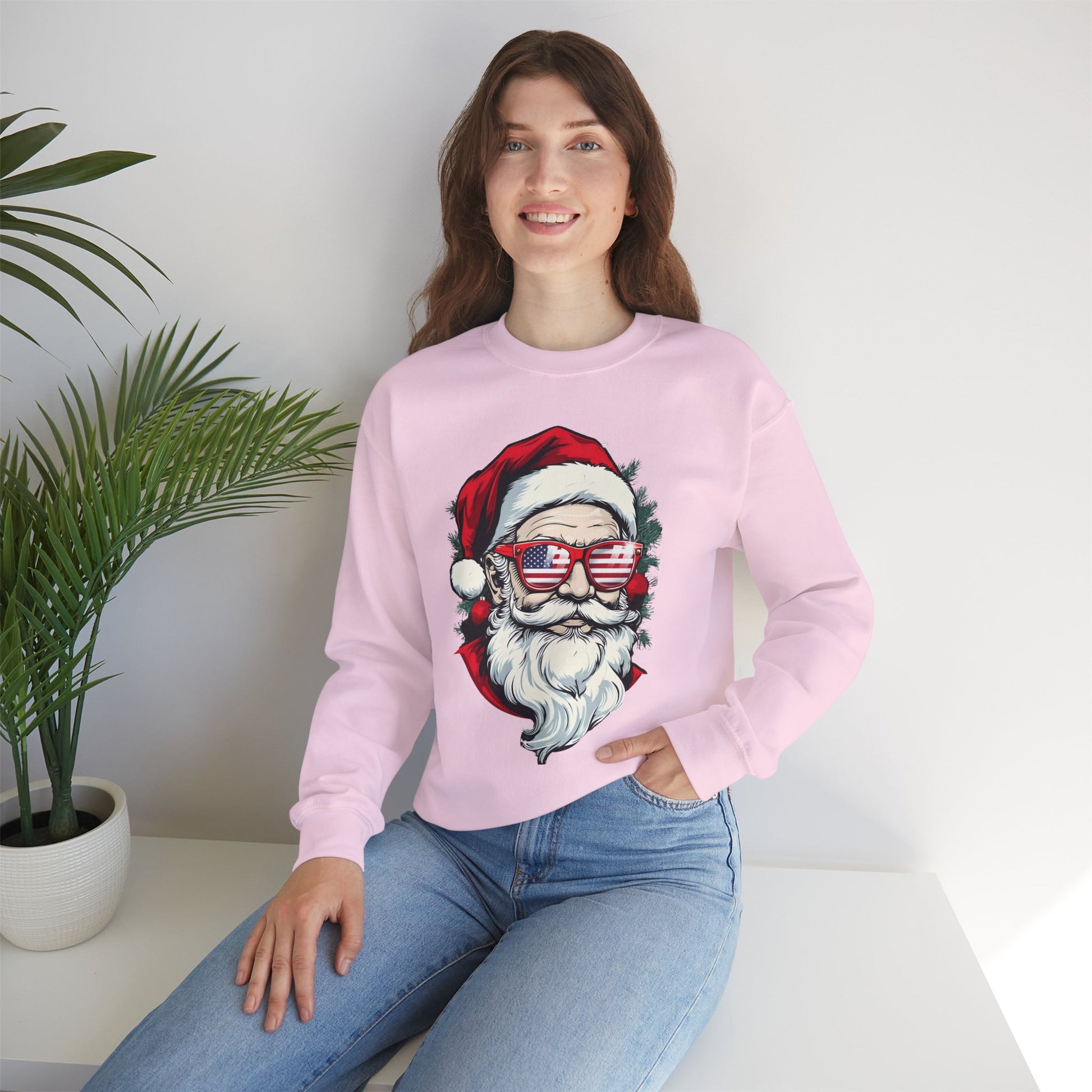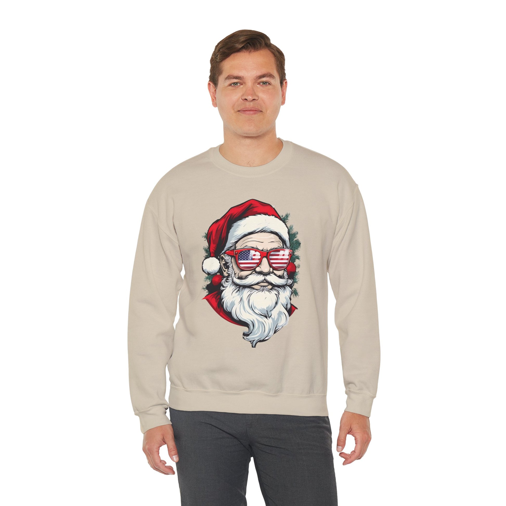 Get into the holiday spirit with this comfy Christmas sweatshirt featuring Santa wearing USA glasses. Available in lots of colors, this unisex heavy blend crewneck sweatshirt is perfect for adults looking for a cozy and festive top to wear during Christmas celebrations.
