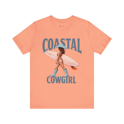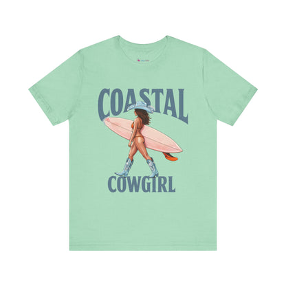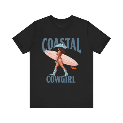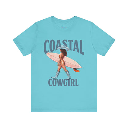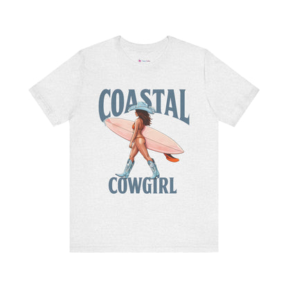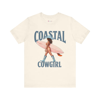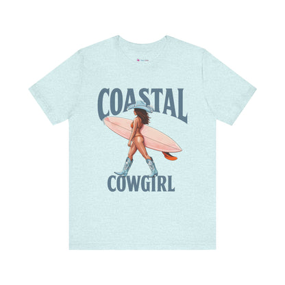 A coastal cowgirl themed t-shirt featuring a cowgirl with a surfboard. Perfect for those who love the beach and western motifs. Ideal for casual wear and summer vibes. Relevant for beach lovers, cowgirls, and those who enjoy a laid-back style. Great for summer, beach vacations, western-themed parties, and casual outings.
