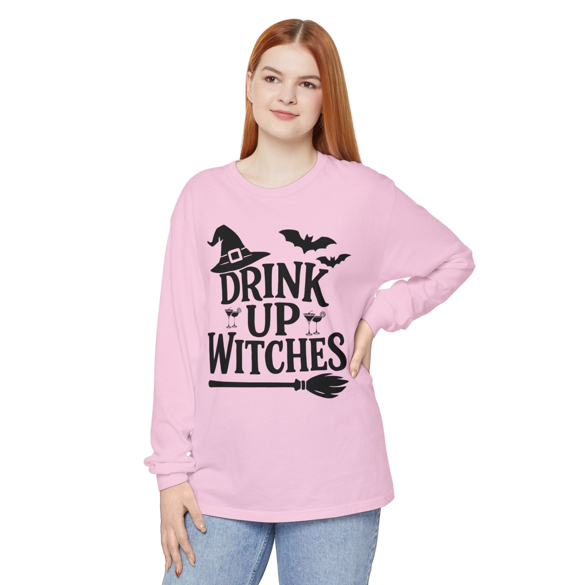 Funny Halloween long sleeve shirt with a witches hat, cocktails and bats that says DRINK UP WITCHES. Perfect for those looking to add a touch of humor to their Halloween wardrobe. Ideal for adults celebrating Halloween parties or other spooky events.