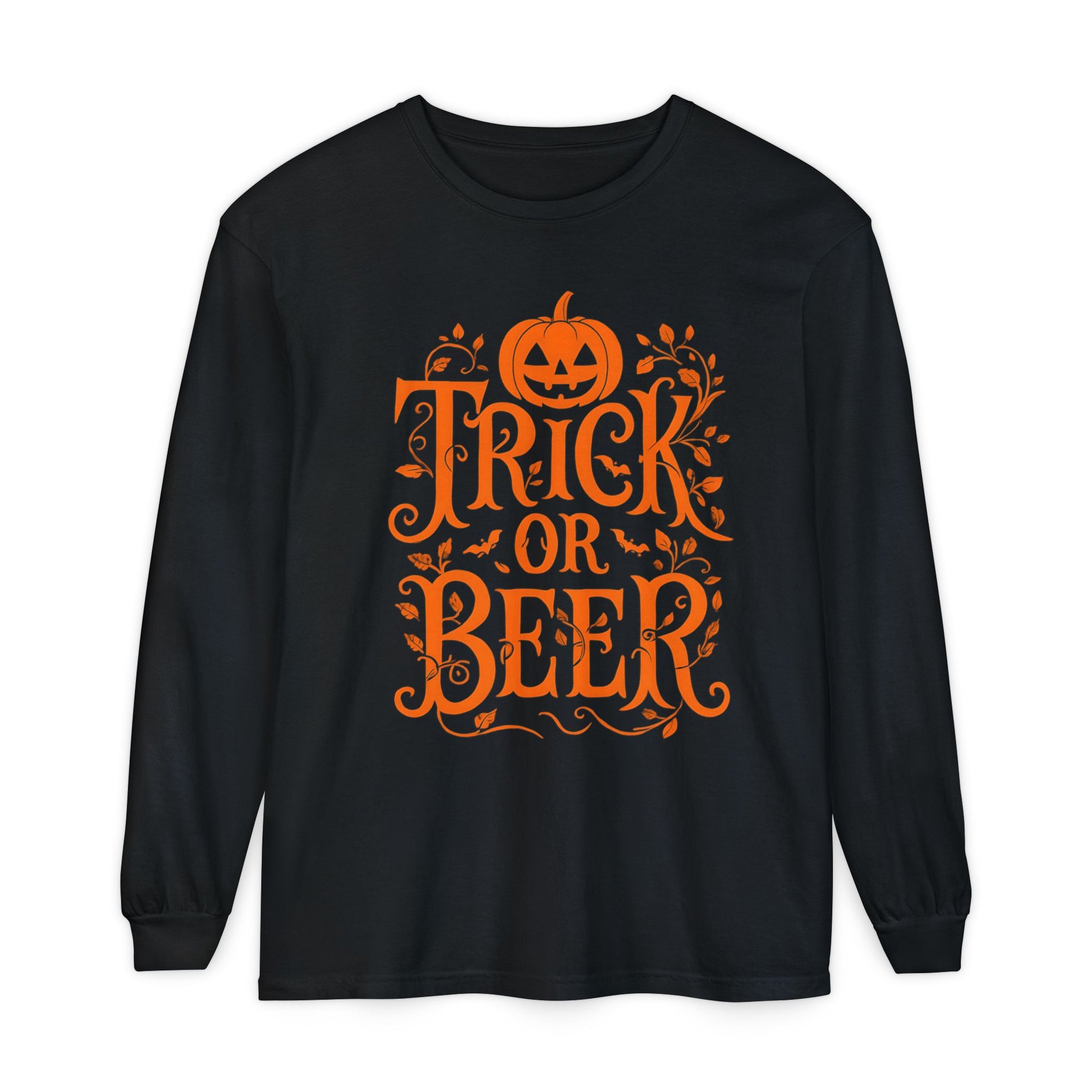 Funny Halloween long sleeve t-shirt that says TRICK OR BEER with a pumpkin and fall vines, perfect for those who love a touch of humor during the spooky season. This garment-dyed shirt offers a soft texture and classic fit, making it a comfortable and durable choice for Halloween festivities or casual wear. Suitable for adults.