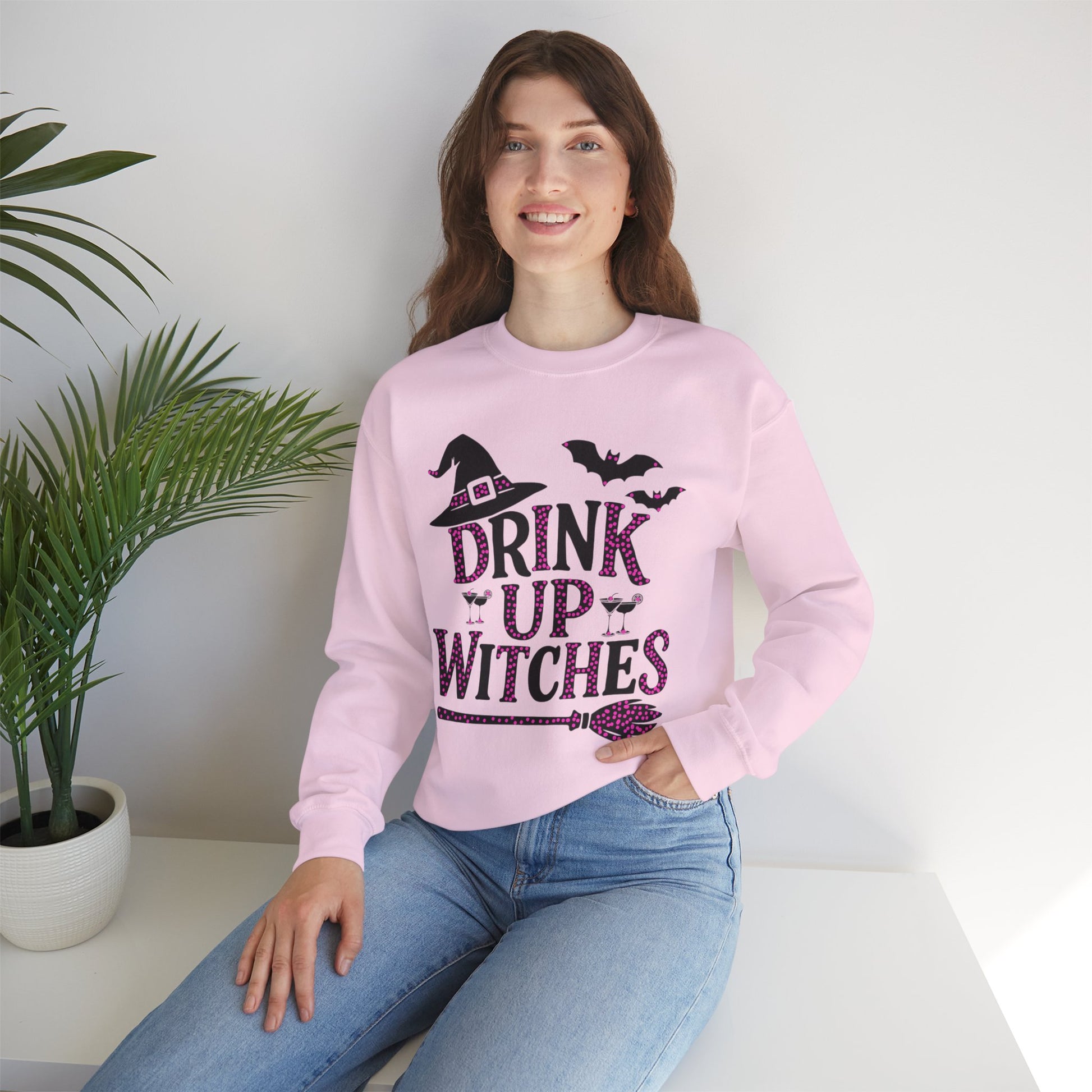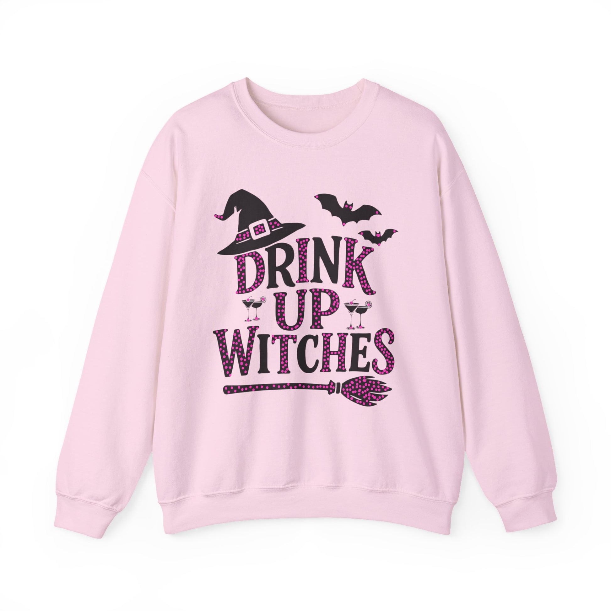 A Halloween Sweatshirt perfect for the spooky season, featuring a fun 'DRINK UP WITCHES' design with a witches hat, broom, and cocktails all adorned with pink polka dots. This cozy sweatshirt is ideal for adults looking to celebrate Halloween in style and make a statement during the festive season.