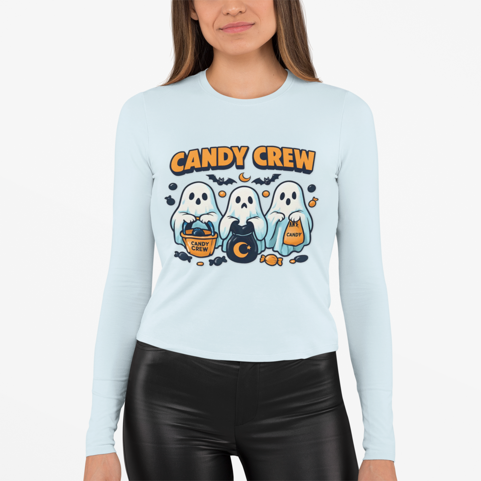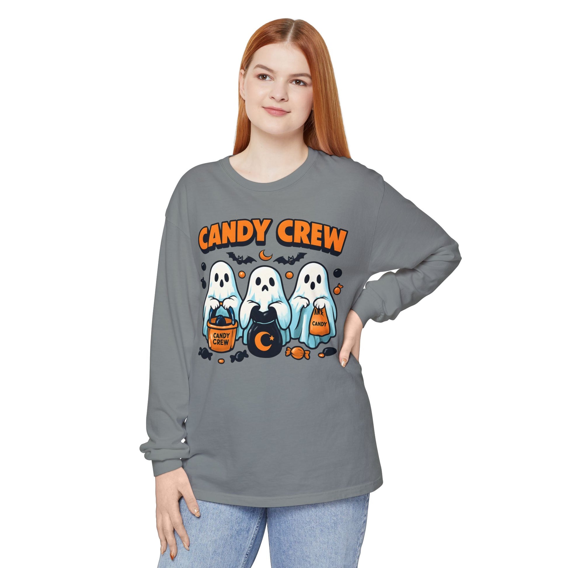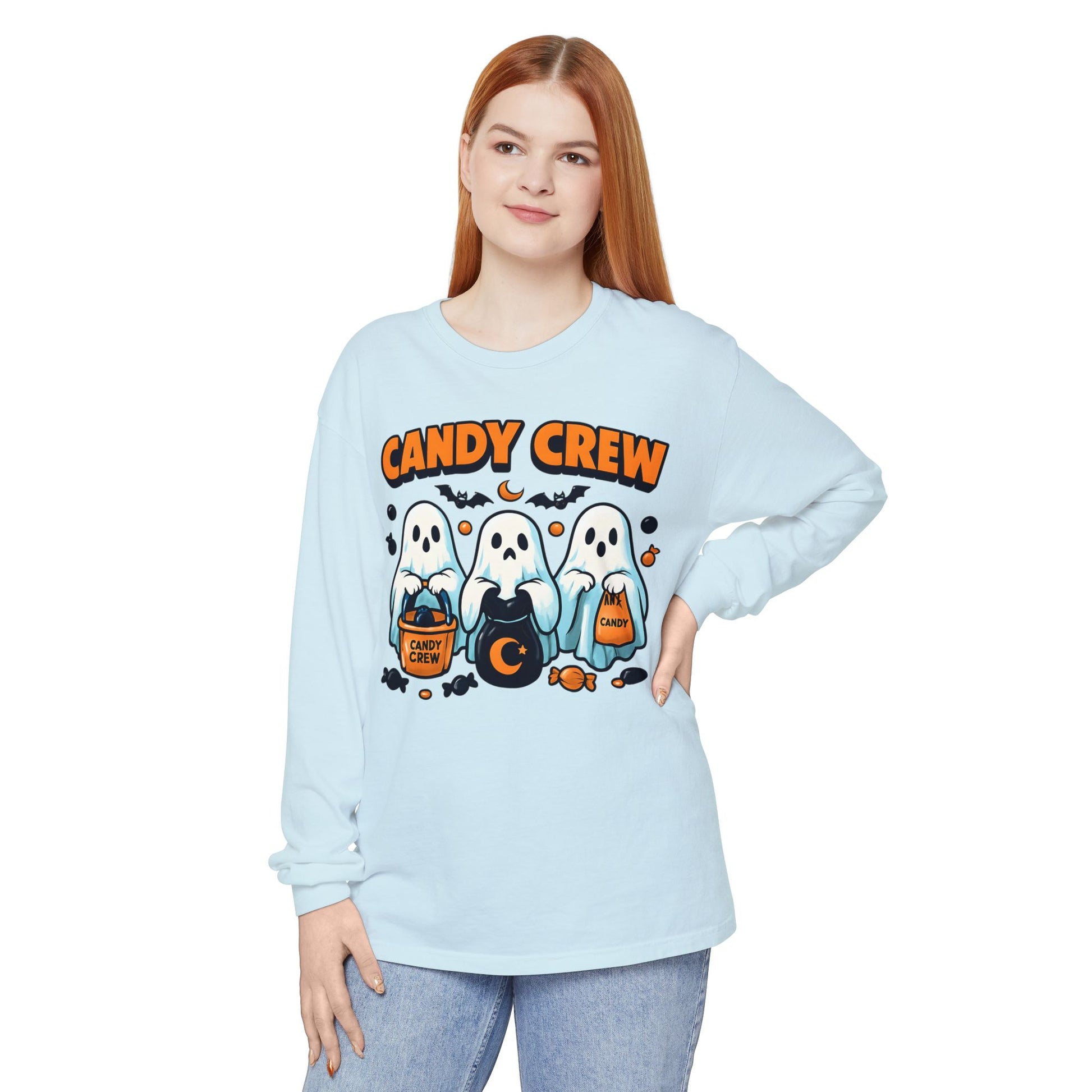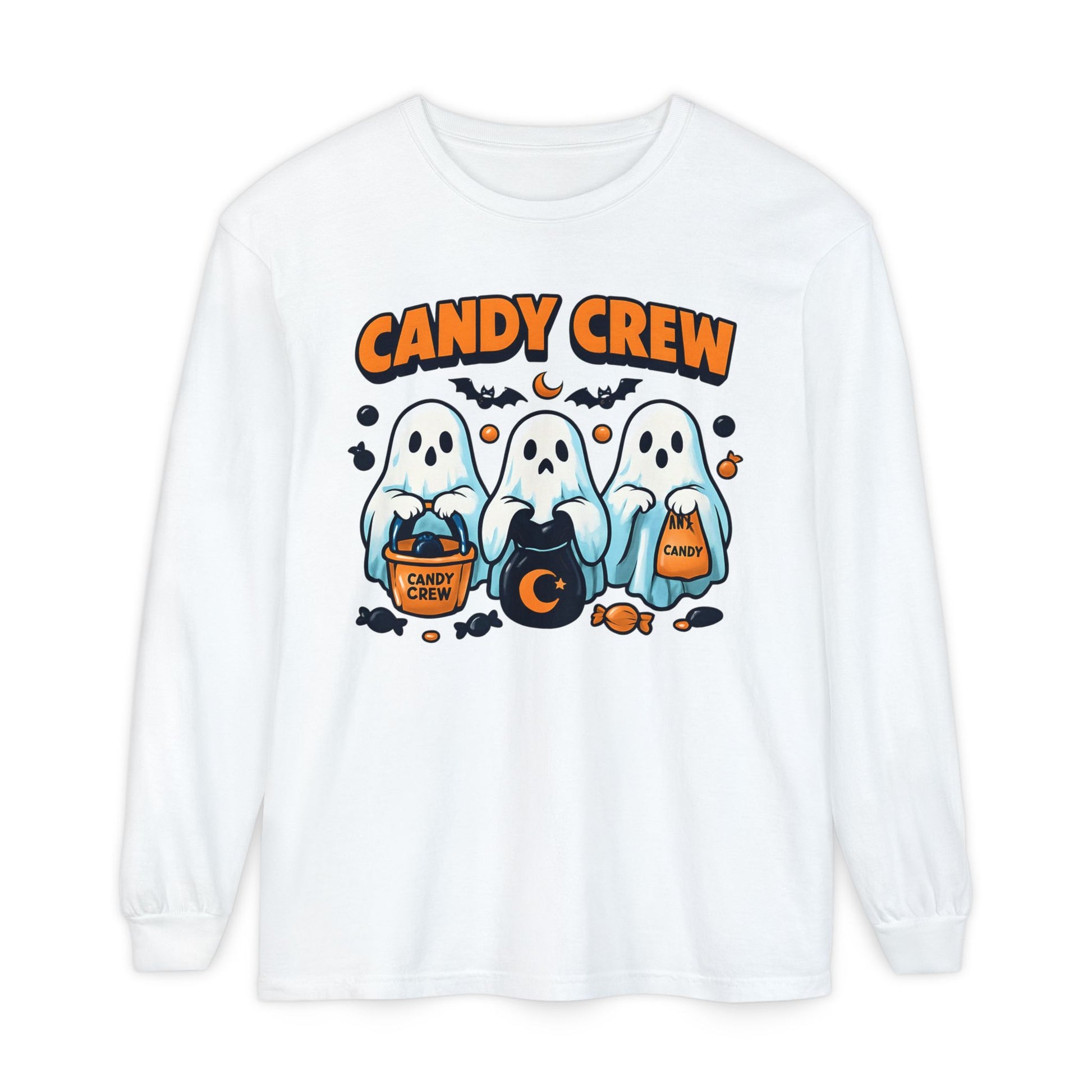 This Halloween Long Sleeve T-shirt features three ghosts holding candy bags with CANDY CREW written above them and pieces of candy around them. Perfect for those who love the spooky season and enjoy dressing up in themed clothing. Ideal for Halloween celebrations and trick-or-treating.