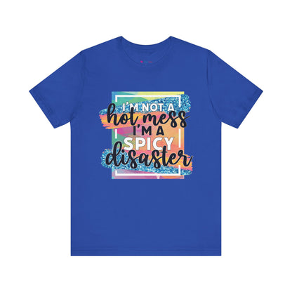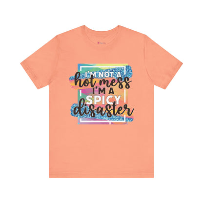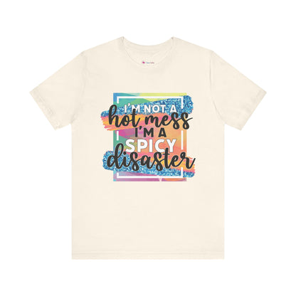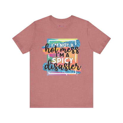 A sassy and confident T-shirt with the phrase 'I'm not a Hot Mess I'm a Spicy Disaster', perfect for those who embrace their chaotic energy. This tee is ideal for casual outings, expressing personality, and making a statement. It appeals to individuals who enjoy humor and want to stand out in a crowd. Suitable for wearing on casual days, parties, and gatherings.