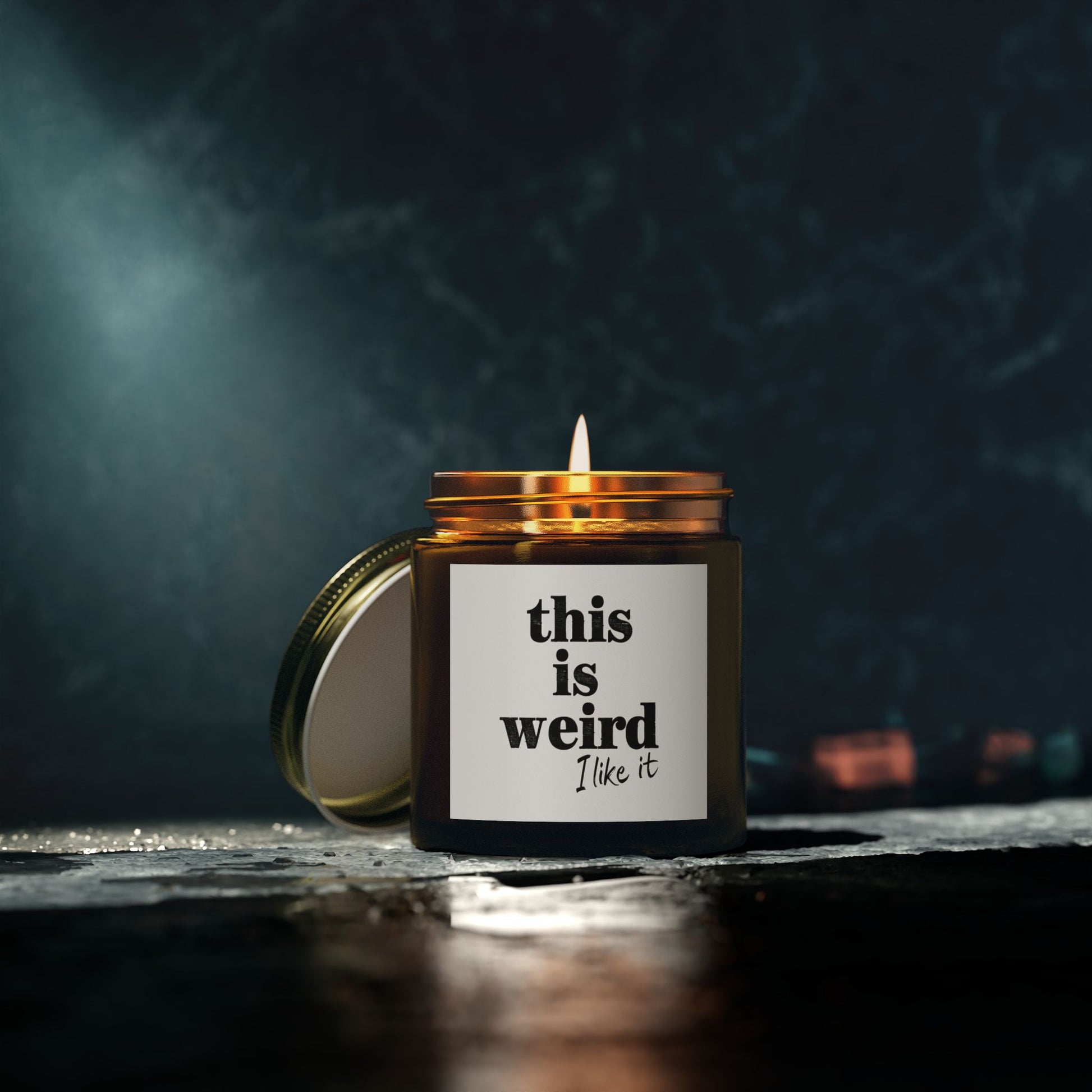 Quirky scented candles with a funny quote saying THIS IS WEIRD I like it. Perfect for unique home decor, a gift for her, relaxation, and self-care must-have. The candles offer aromatherapy benefits and create a warm and tranquil atmosphere. Ideal for individuals who enjoy humor and want to add a touch of quirkiness to their living space. Great for gift-giving during birthdays, holidays, or as a general pick-me-up present.
