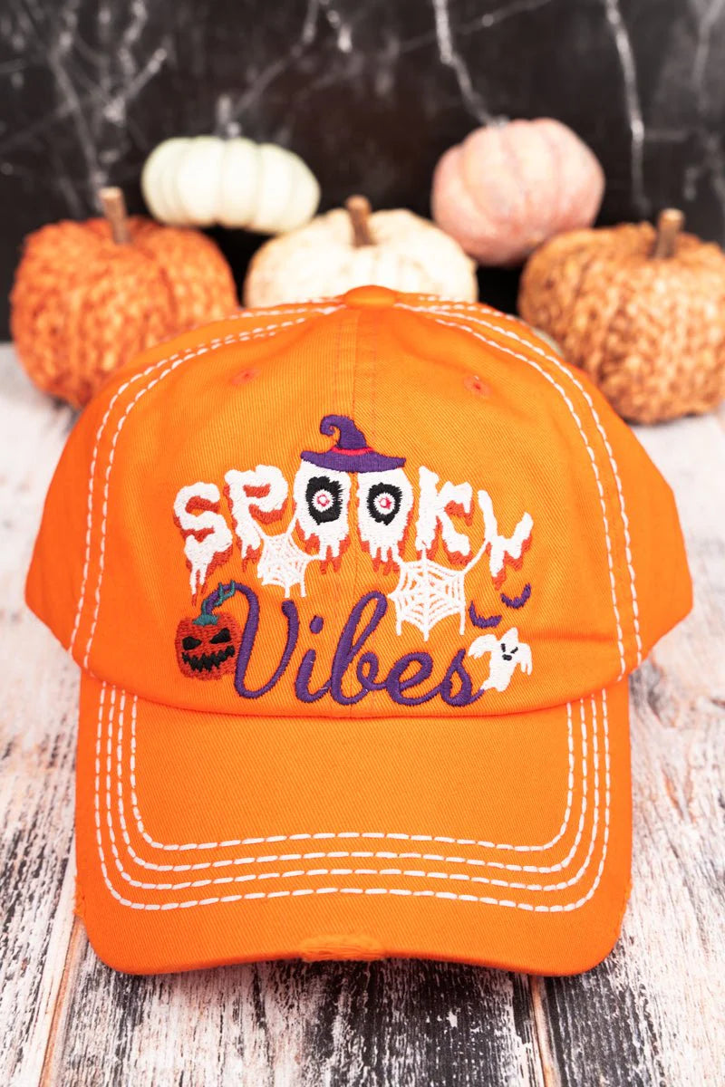 The Skinny: Super cute KB distressed hat, Velcro closure in back. Really colorful Spooky Vibes Emboidered on front.
