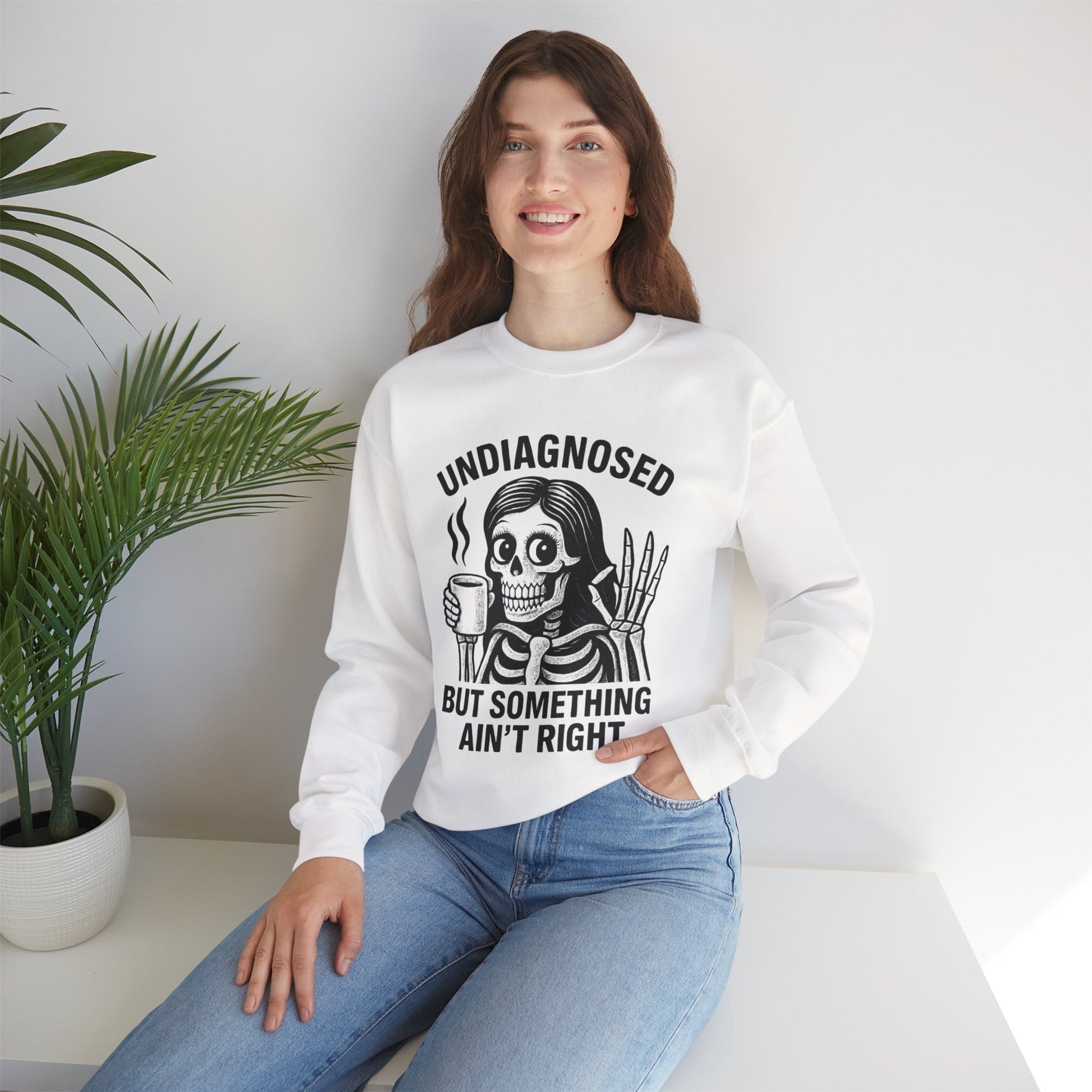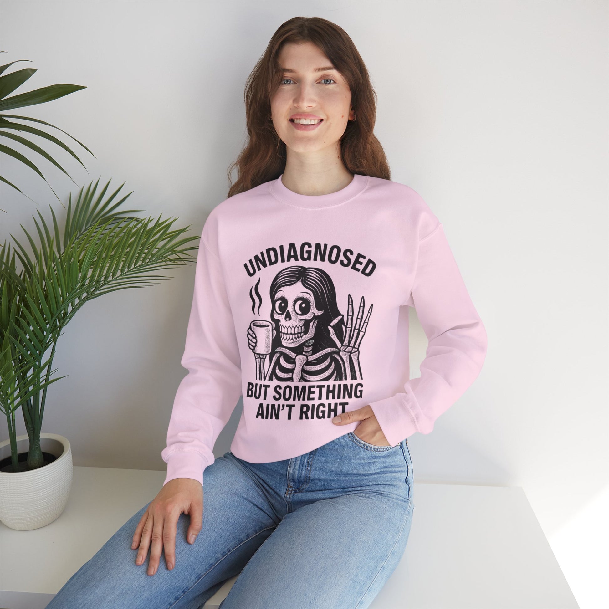 A comfy unisex crewneck sweatshirt with a funny quote that says UNDIAGNOSED BUT SOMETHING AIN'T RIGHT along with a picture of a women skeleton holding a cup of coffee giving the OK sign. Perfect for those who enjoy quirky and humorous designs, this sweatshirt is ideal for lounging at home or running casual errands. It can be a great conversation starter and is relevant for Halloween, comedy lovers, and those with a unique sense of humor.